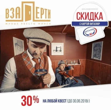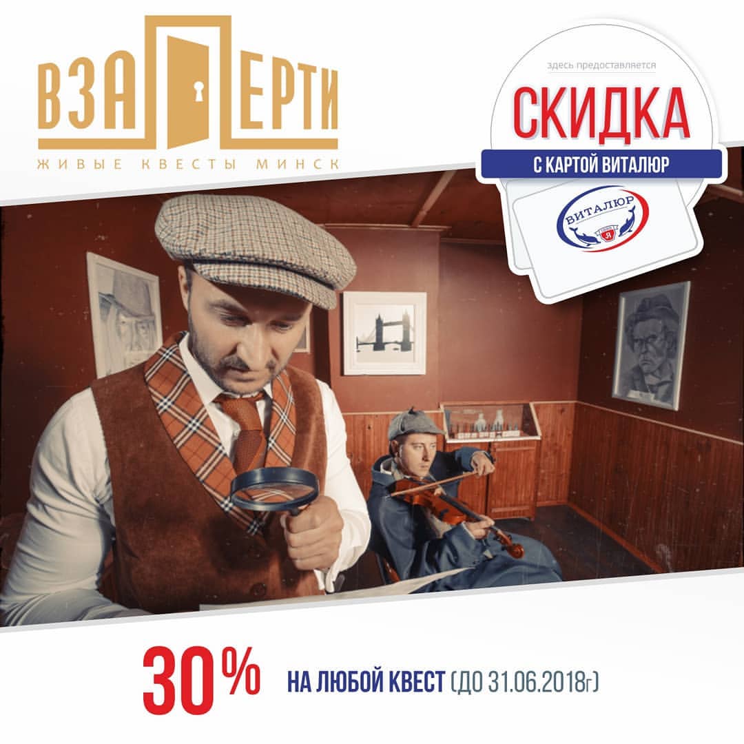 Новая акция совместно с нашими партнёрами @vitalur_by . С картой Виталюр у нас можно получить скидку на любой квест - 30%. Ждём Вас Взаперти