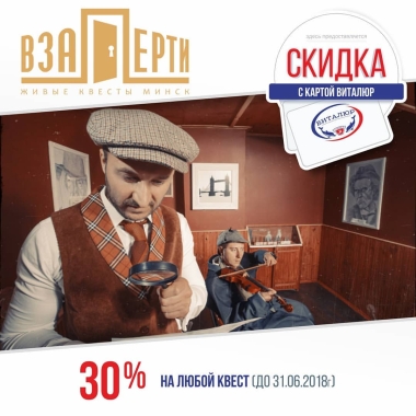Всем поклонникам загадочных расследований мы дарим скидку 30% на любой из квестов от наших партнеров Виталюр при предъявлении карты!